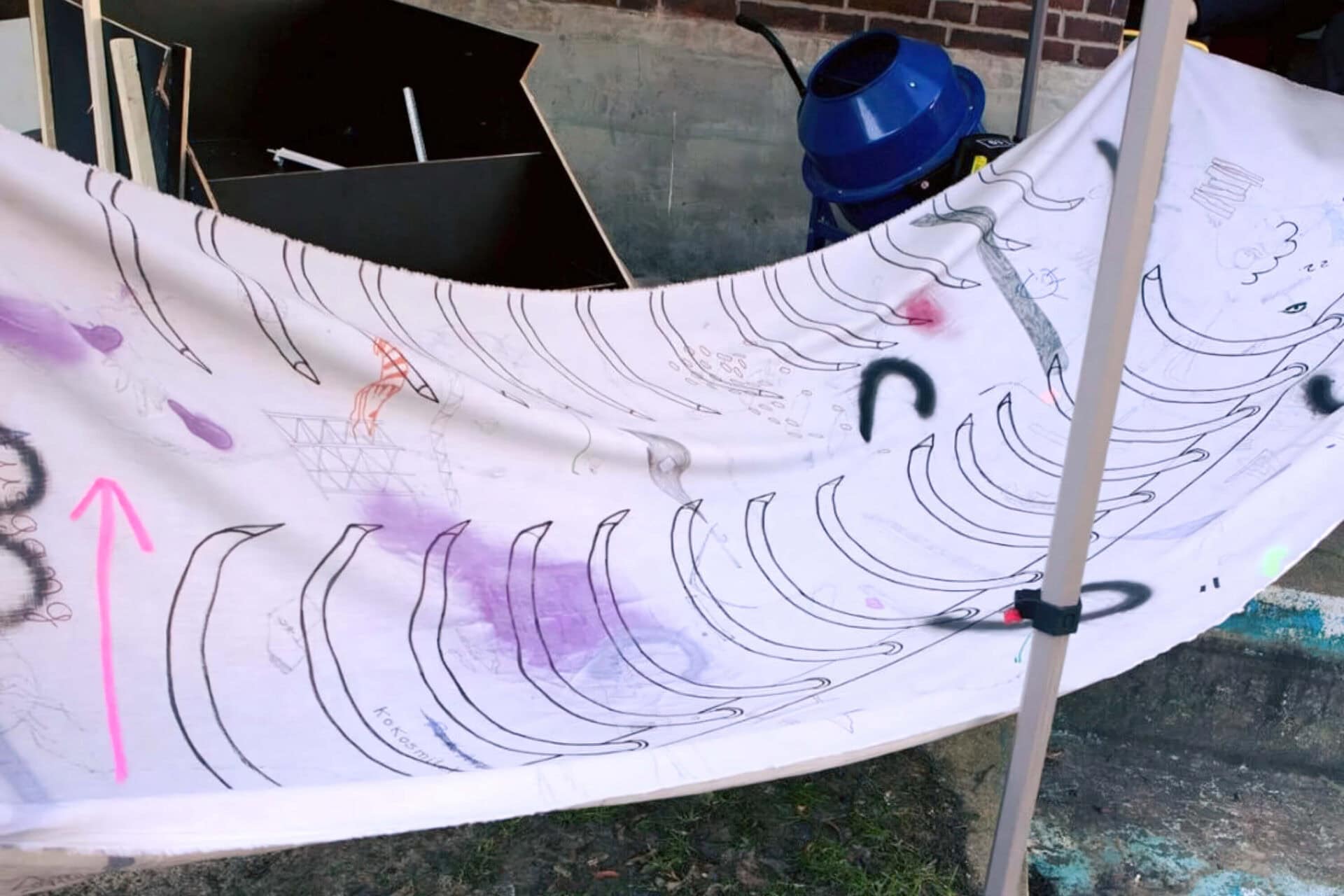 Under its weight, the ruin trapped the drawings that recalled moments lived in the city and which were captured on fabric. Over time, the ruin fell to pieces, until one day the remains of a canvas on which someone had drawn something were recovered from the rubble.